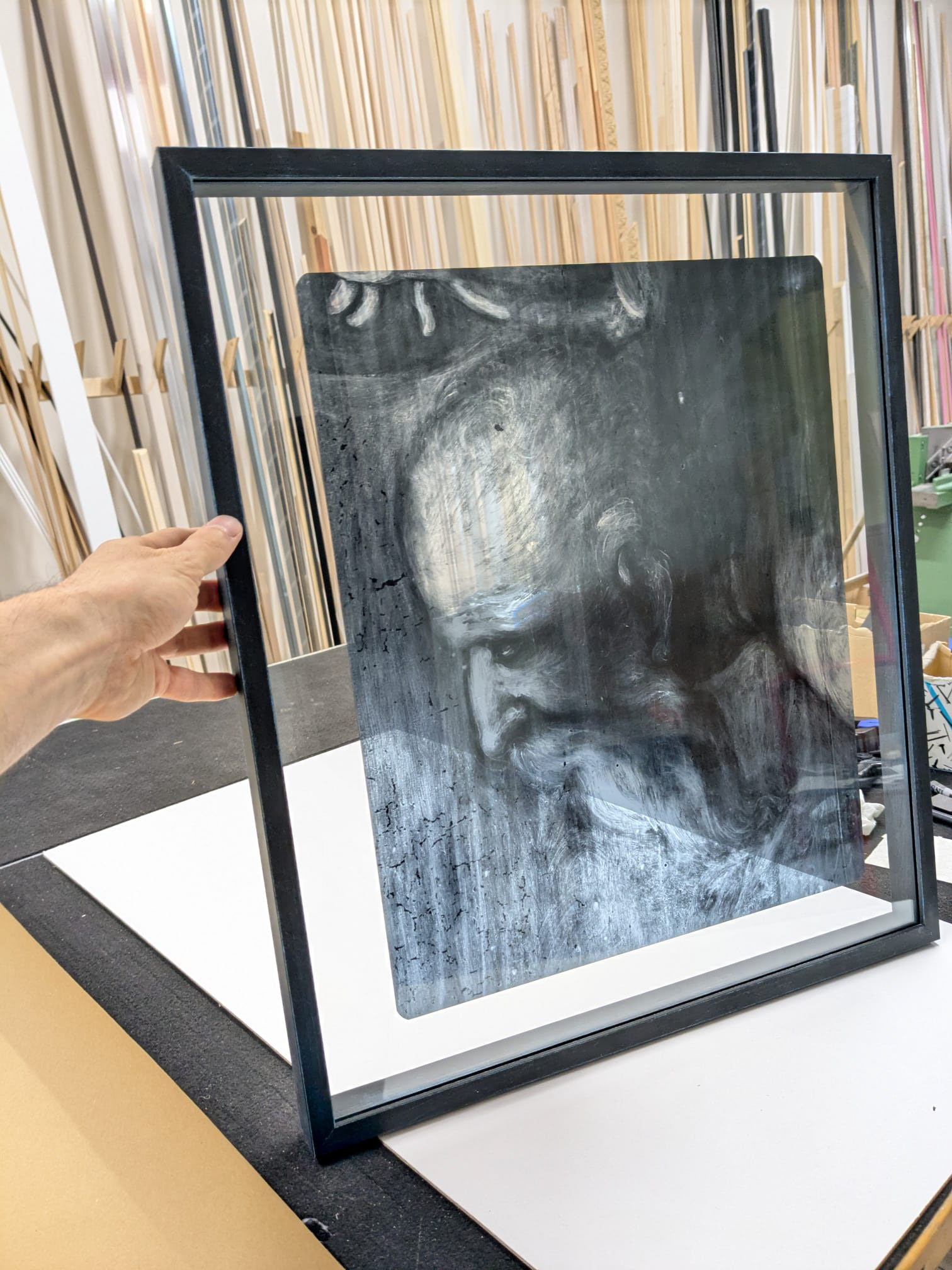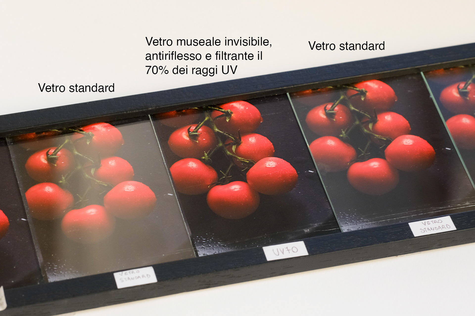 Per proteggere e valorizzare: offro il vetro invisibile ad alta protezione UV (70%), trasparente e antiriflesso. Oltre a preservare la stampa, garantisce una visione nitida e senza distrazioni.